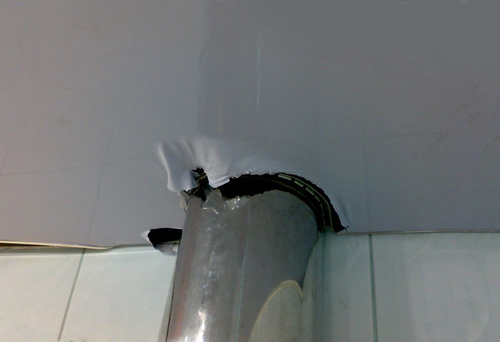 Дырки в ПВХ-потолке разрастаются быстрее, чем нам хочется, так что скотч с повреждения снимайте непосредственно перед приклеиванием куска пленки, пусть на место временной заплаты мгновенно придет постоянная.