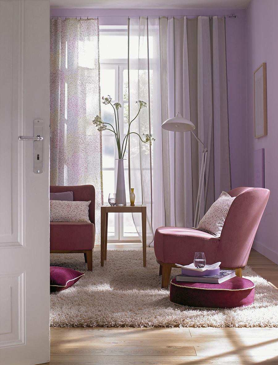 Помещение спальни или гостиной можно сделать таинственным, романтичным и чувственным, подобрав к нежно-розовым занавескам плотные сиреневые шторы.