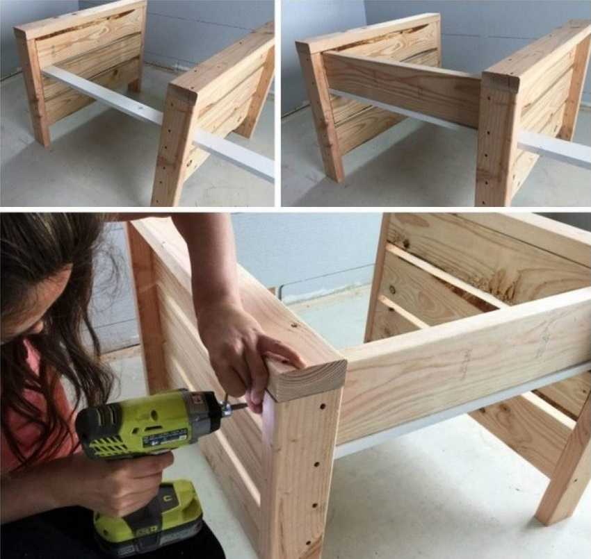 - отрезанную доску крепим к верхней части спинки, как на фотографии, и пускаем еще две планки, прибиваем их к этой верхней доске.