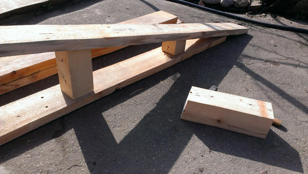 Другой деревянной разновидностью служит конструкция, сбитая из обрезков доски с равной толщиной заготовок. Обычно основанием для каждой опоры служит пара прочных широких реек, толщиной около 40 мм. и длиной 1,5-2,0 м. На них ступеньками набивают поперек планки до нужной высоты (около полуметра). Передняя часть также оснащается противооткатом. Для удобства переноски к конструкции набивают петли-лямки из прочного материала. Итоговая стоимость изделия минимальная.
