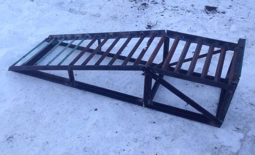 Горизонтальный и въездной трапы изготавливают из уголка 63 мм и арматурных прутков, выполняющих роль «лесенки». Длина наклонного трапа для легковой машины должна быть не менее 3 метров. Размер горизонтального участка выбирают, прибавив к длине автомобиля 1 метр. Ширина трапов не менее 40 см.