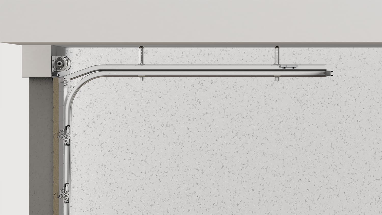 Пониженный. Притолока — от 150 мм до 350 мм. В этом случае в открытом состоянии нижняя секция свисает на 80-150 мм, перекрывая верхнюю часть проема. Есть два варианта — барабан сзади и впереди. Барабан впереди ставится на притолоках высотой от 220 мм до 350 мм, используется специальная радиальная направляющая, из-за этого цена выше, чем на стандартный подъем. При размещении барабана сзади, на обычной направляющей устанавливаются концевые кронштейны, на которые крепится вал. При низком подъеме можно поставить привод для автоматизации ворот только на потолке.