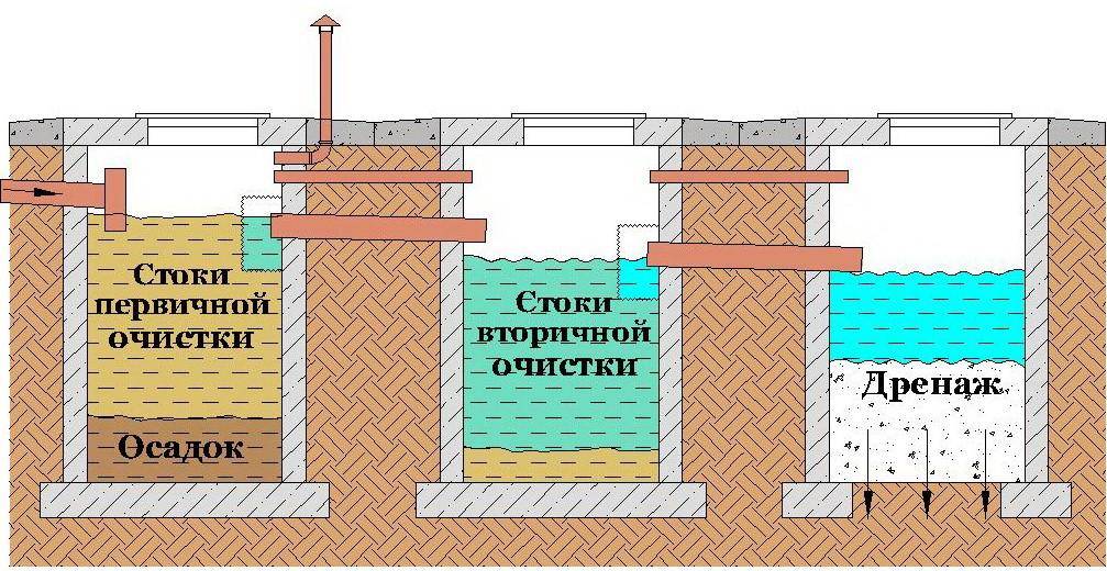 При низком уровне грунтовых вод в качестве такого устройства применяют фильтрационный колодец, при высоком – поле фильтрации. Таким образом, откачивать приходится не весь объем отходов, а только осевший в камерах ил.