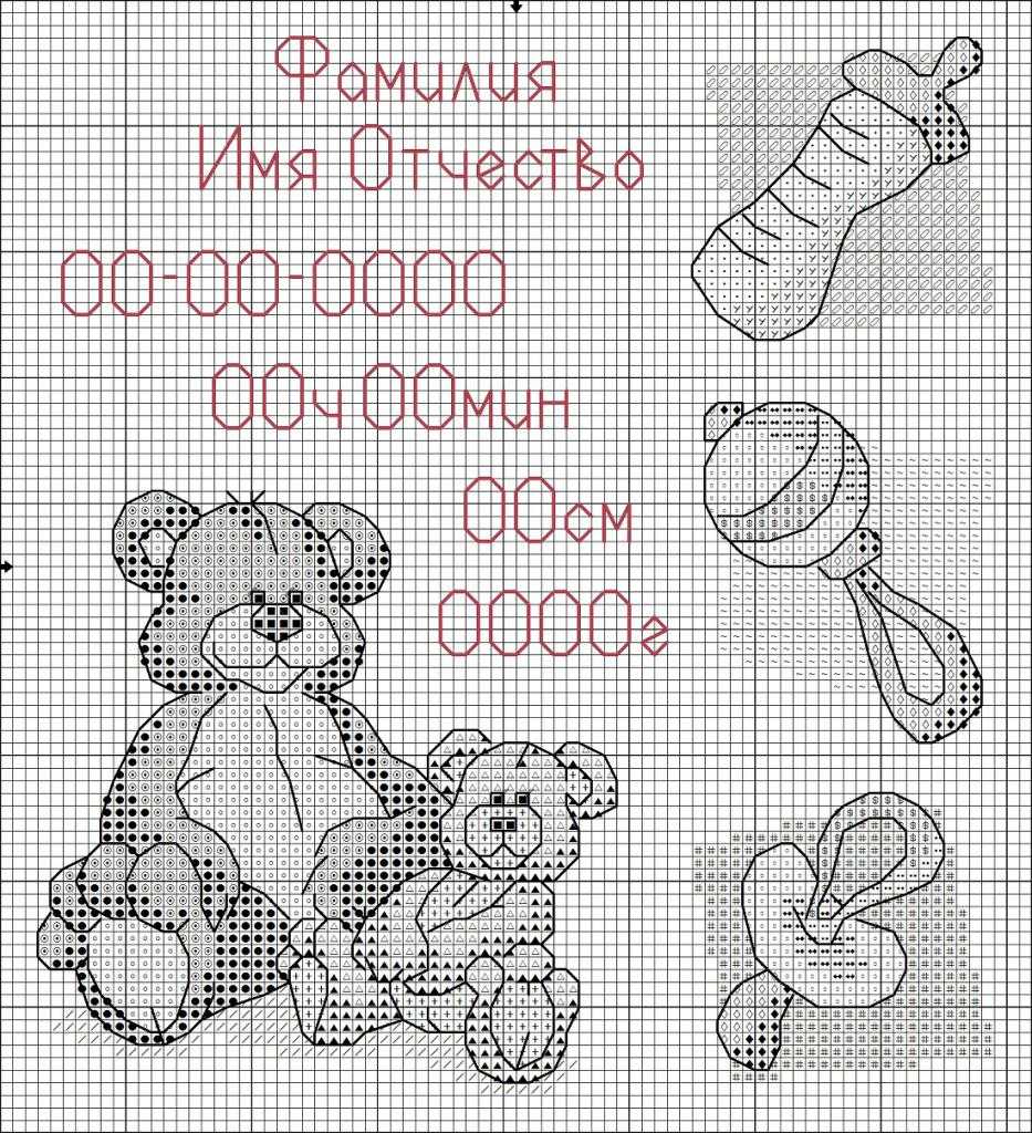 Сюжетов детских метрик много, очень популярная детская метрика это рисунок с веселым сюжетом или героями мультиков. Это самая простая вышивка для начинающих. Схема для метрики не сложная, а палитра нитей мулине содержит 10-15 цветов Вышивка крестом метрики для новорожденного должна содержать следующие данные новорожденного: имя малыша, дату рождения, вес, рост, время рождения. Шрифты для вышивки имен смотрим тут.