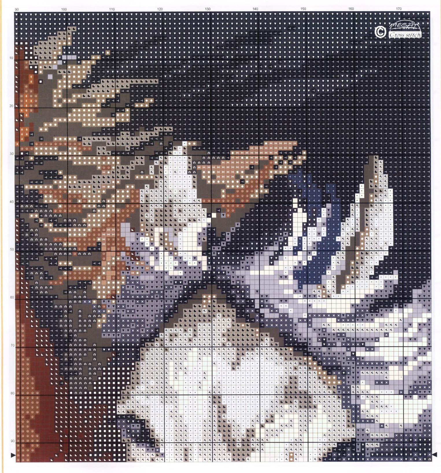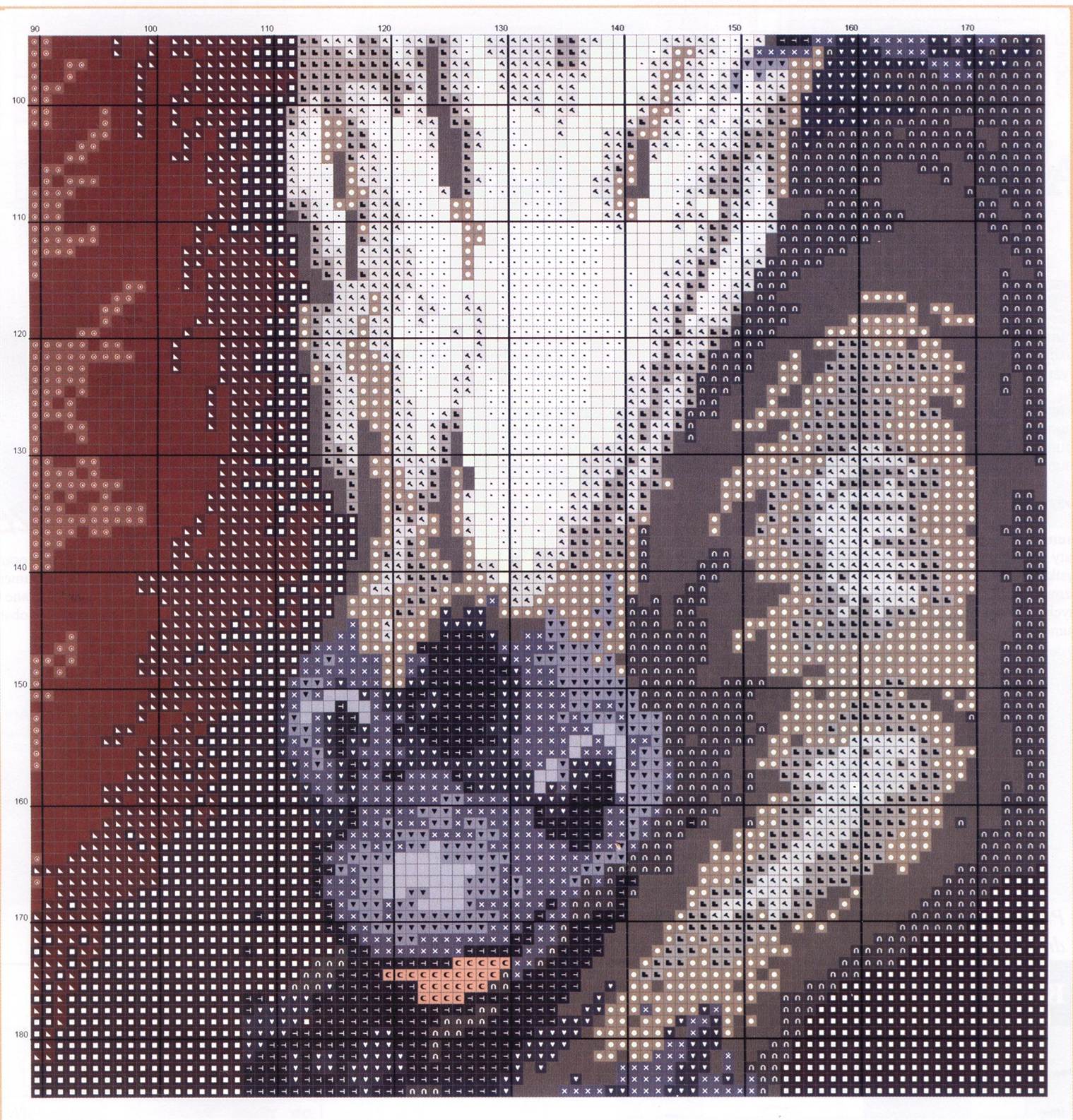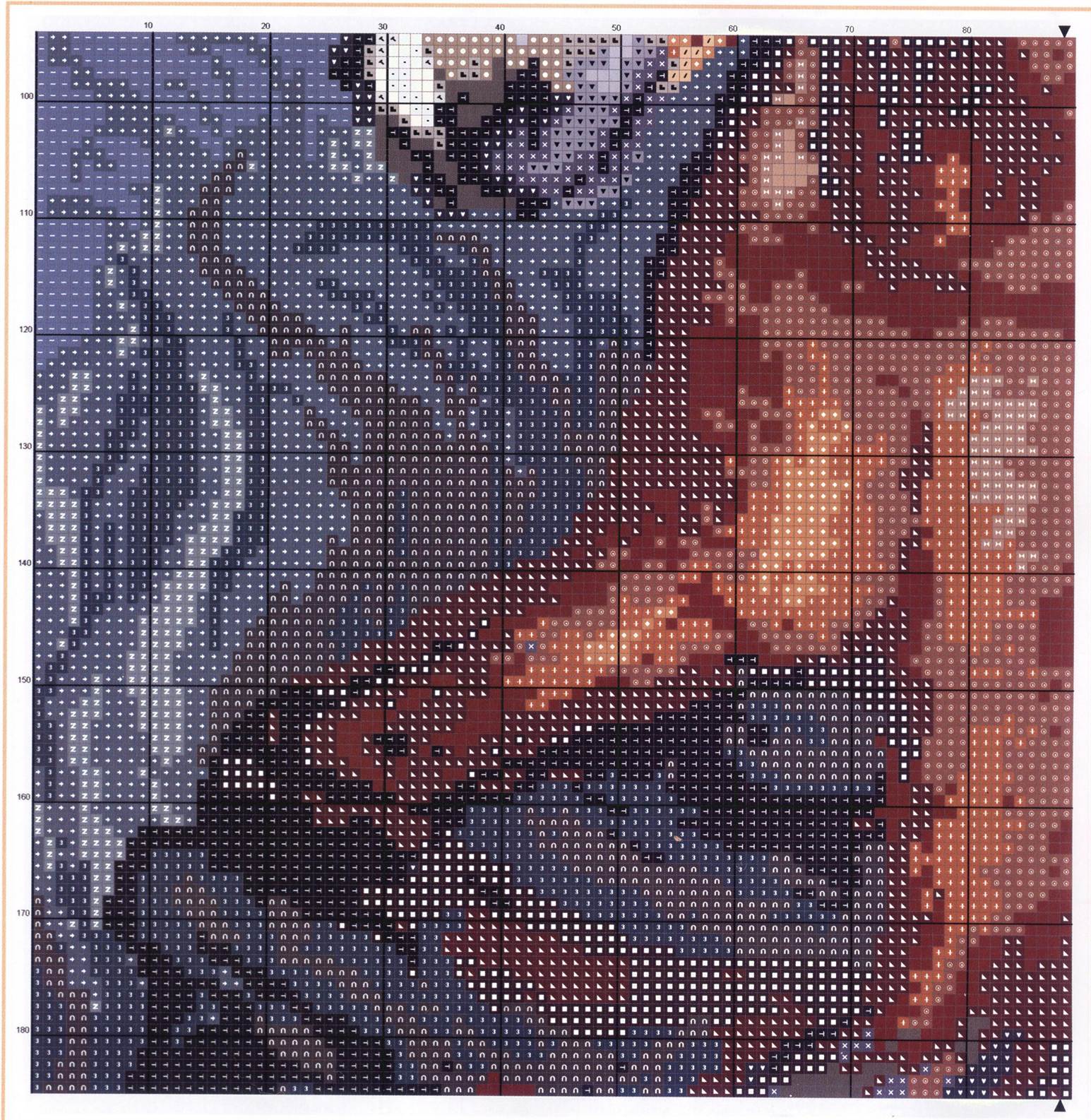 Нить, предназначенная для работы, крепится с изнаночной стороны под стежками, которые были выполнены вначале. Фрагменты требуется делать последовательно друг за другом, и по окончании его оставшуюся нить проводить под стежочками. Это делается для того, чтобы не создавать лишние узелки, мешающие полноценному просмотру будущего изображения. Выполнять рисунок стоит по горизонтальным рядам, начиная от нижнего и заканчивая верхним стежочком. Произведение может создаваться, используя как две нити, так и одну. Единственное, что в первом случае такое желательно делать при выполнении сюжетной линии. Нужно знать, что картина будет выглядеть аккуратно только в том случае, если соблюдается порядок наложения верхних и нижних стежков. Далее рассмотрим графический план по созданию шедевра: