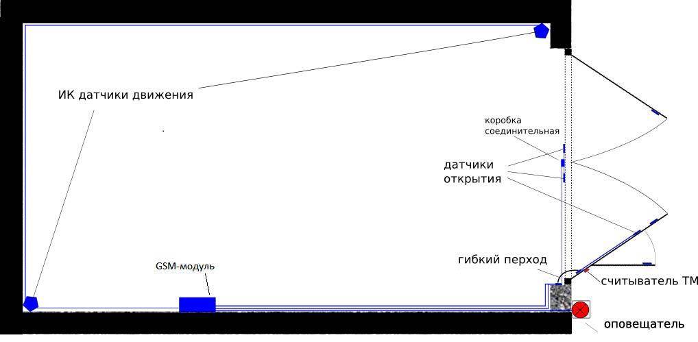 В процессе монтажа такой сигнализации датчик перемещений располагается на двери, а при входе устанавливают кнопку постановки сигнализации на охрану. В качестве реле используются устройства на 12 или 24В.