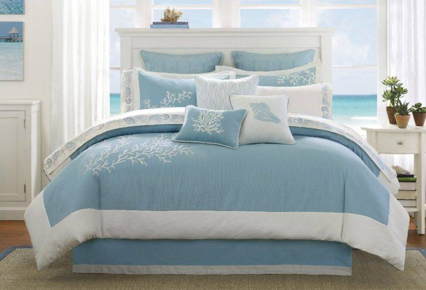 Выбирая синее постельное белье, плед, покрывало, подушки, важно следить за тем, чтобы их оттенок гармонировал с окружающей обстановкой.. Идеальным вариантом для спальни в синих тонах станет белоснежная постель. Цветные варианты уместны, если они гармонично сочетаются с интерьером
