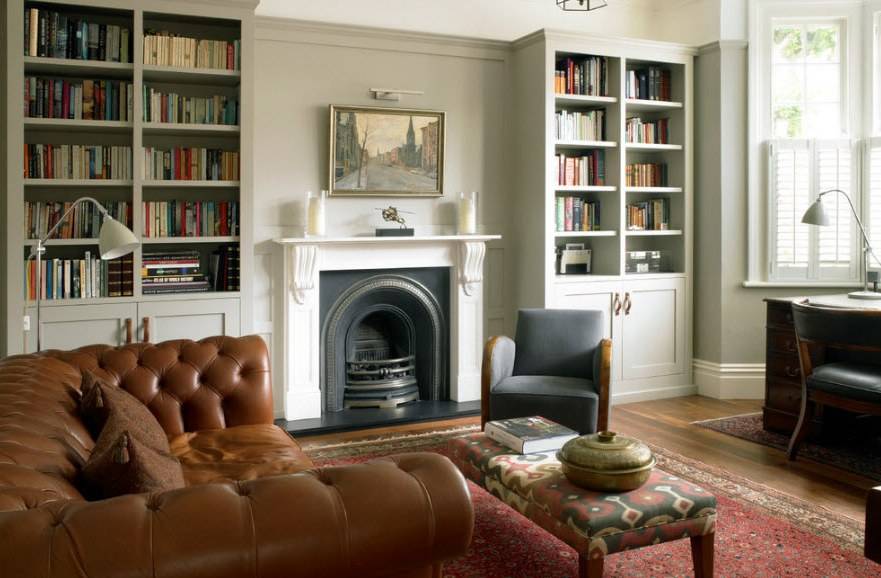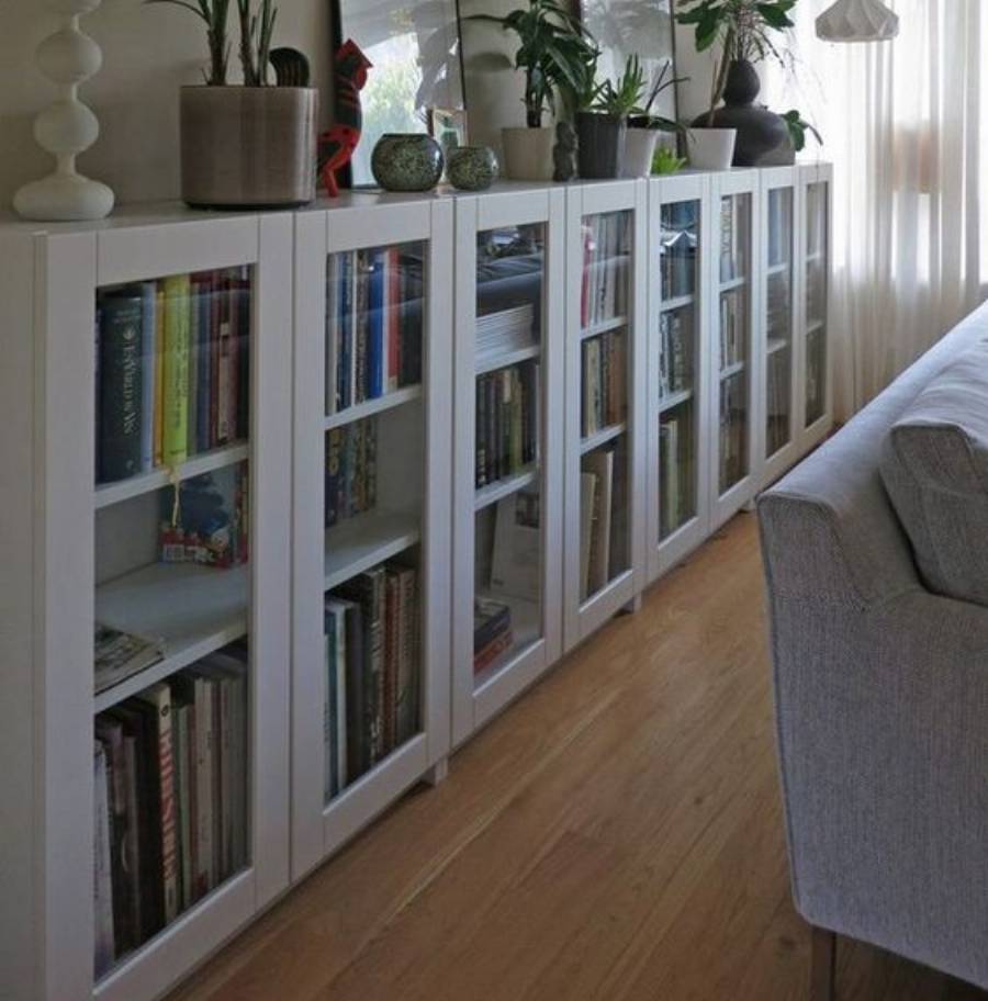 Чтобы в интерьере книжный шкаф смотрелся привлекательно, следует не только подбирать сам предмет мебели, но и выяснять, где его лучше поставить, в каком помещении и даже части комнаты. У самой стены допустимо использовать как узкие, так и широкие шкафы, единственное условие — чтобы получилось выставить в них всю нужную литературу. Рядом ставят стенку, тумбы, диваны либо мягкие кресла.