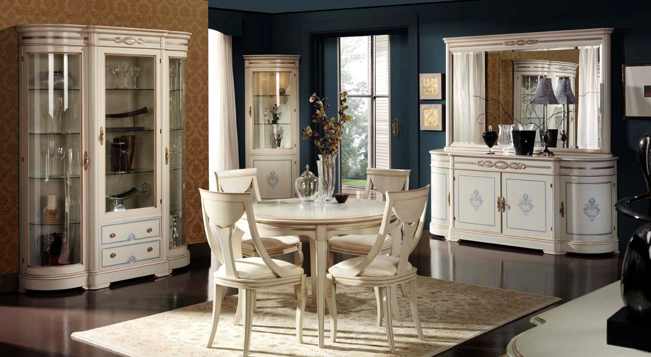 В классике также уместен и угловой шкаф для посуды в гостиную – все зависит от параметров комнаты. Обычно подобные модули выбирают для помещений с ограниченной площадью. Либо же гарнитур настолько велик, что поставить его без углового модуля просто невозможно.