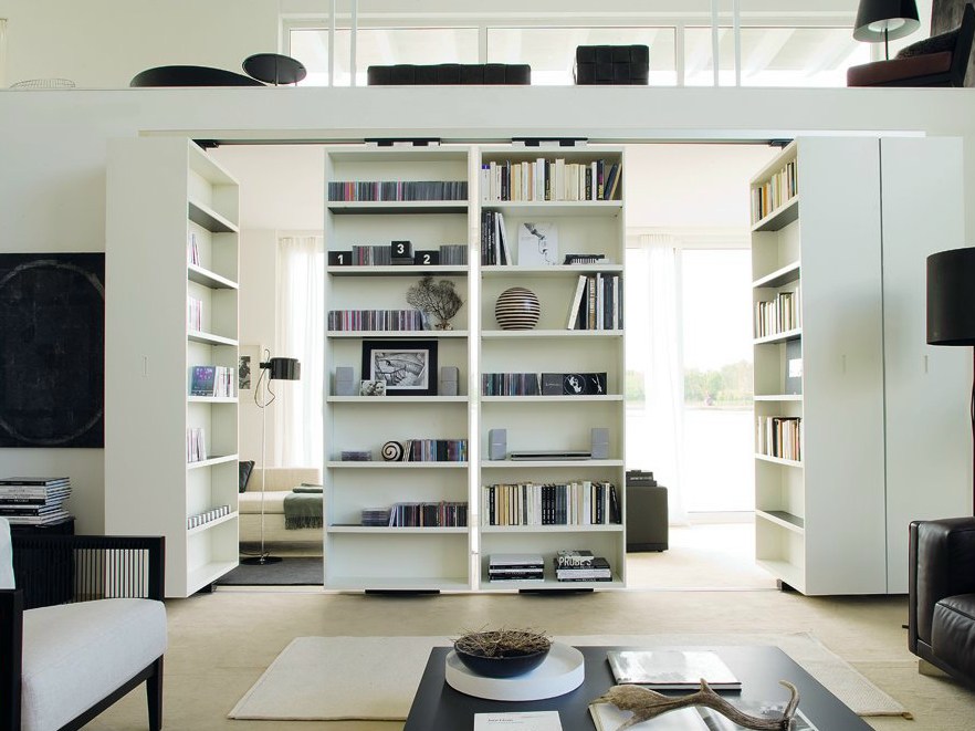 Для углов незначительных по размеру помещений предпочтительнее угловые шкафы, которые поглощают мало пространства, позволяя выставить на полки большой объем книг. По желанию заказчика используются элементы, повышающие функциональность. Центр комнаты уместнее занять шкафом витринного вида с круговыми стеклянными стенками — это позволит разграничить монолитное пространство на блоки. Нежелательно ставить первый вариант на середину, а второй к стене, учтите данный момент (и то, что «витрины» привлекательны лишь в просторных комнатах).