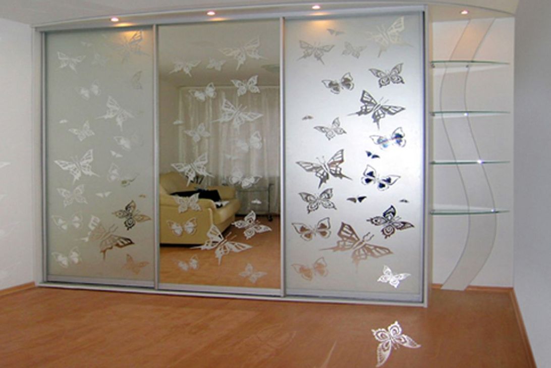 Например, на матовое стекло при помощи пескоструйной машины наносится оригинальный орнамент. Такие дверцы часто сочетаются с зеркальными элементами. В качестве орнамента выбираются цветы, вьющиеся растения, бабочки, городские пейзажи, натюрморты.