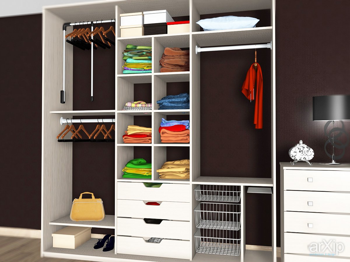 При разработке дизайна и проектировании внутреннее пространство шкафа распределяется в зависимости от того, для чего его вообще заказывают (или изготавливают). Классический шкаф-купе в прихожей должен вмещать в себя много верхней одежды. Соответственно, под верхнюю одежду отводится наибольшая часть внутреннего пространства.