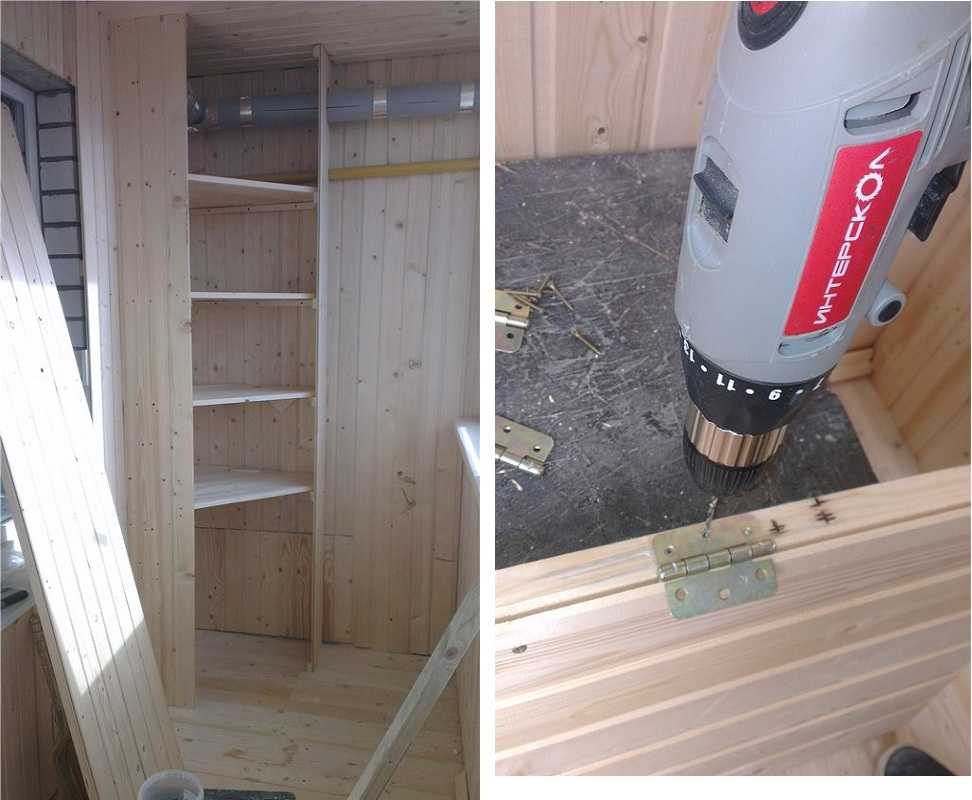Стойки не крепили. Прибили бруски на потолке и к полу, к ним стенки. Они получились короткие — в три дощечки. К вагонке стен прибили планки, на которые уложили ту же вагонку, вырезанную по получившейся форме шкафа.