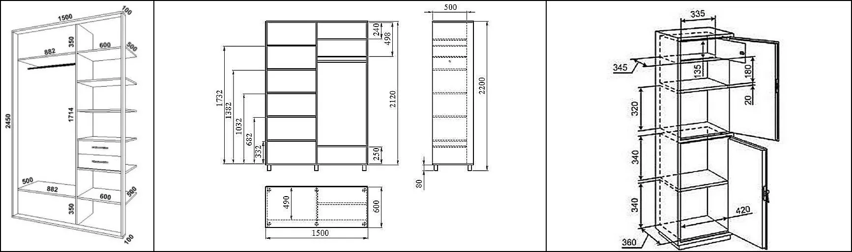 Не взирая, на особенности, для всех чертежей важно соблюдение чётких размеров. Длина, ширина и высота внешних частей и размеры внутренней составляющей, перенесённые на бумагу должны чётко соблюдаться при изготовлении шкафов. Изделие не получиться таким, каким его задумали, если размеры хотя бы одной детали будут нарушены