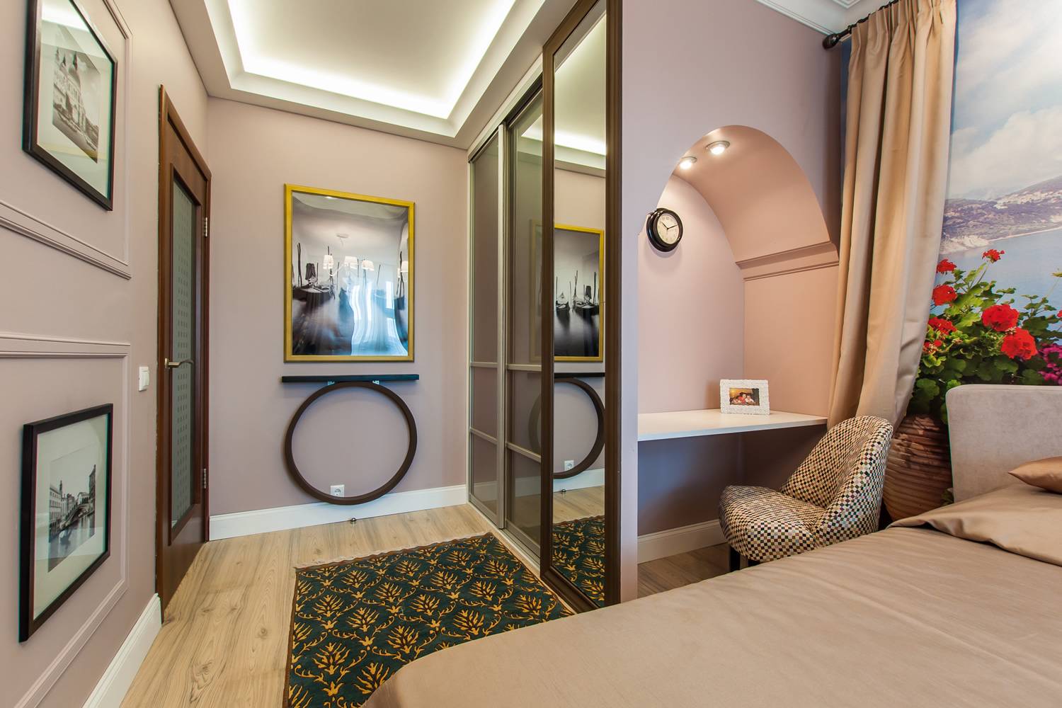 «Невидимые шкафы». Актуально для встраиваемых шкафов-купе, устанавливающихся на всю стену. Такой угловой шкаф в интерьере практически не заметен, поскольку его фасад соответствует расцветке стен.