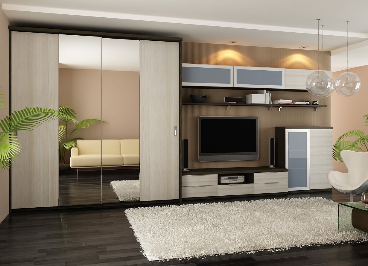Если гостиная просторная, то очень моден сегодня вариант c размещением шкафа купе у длинной стены — от стенки до стенки. О преимуществах такого варианта мы уже поговорили с вами выше, поэтому повторяться не будем. Скажем только то, что, чтобы бы компенсировать потерянное пространство, раздвижные двери для шкафа -купе можно сделать зеркальными. Таким образом комната зрительно увеличится в два раза.