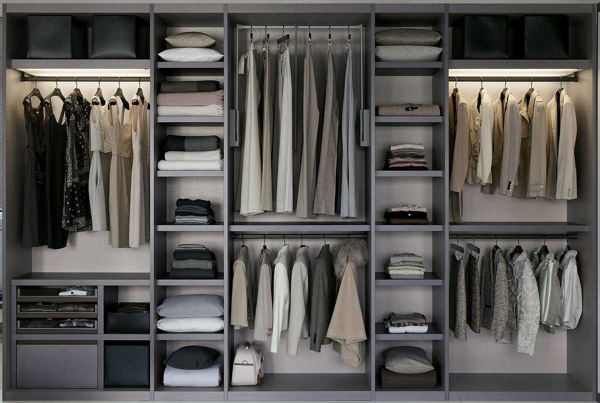 Схема наполнения шкафа подбирается индивидуально. При этом необходимо учитывать габариты самой мебели. Оптимальный вариант — чтобы изделие было оснащено сразу всеми приспособлениями для хранения, поскольку в этом случае одежду удастся разместить максимально компактно.