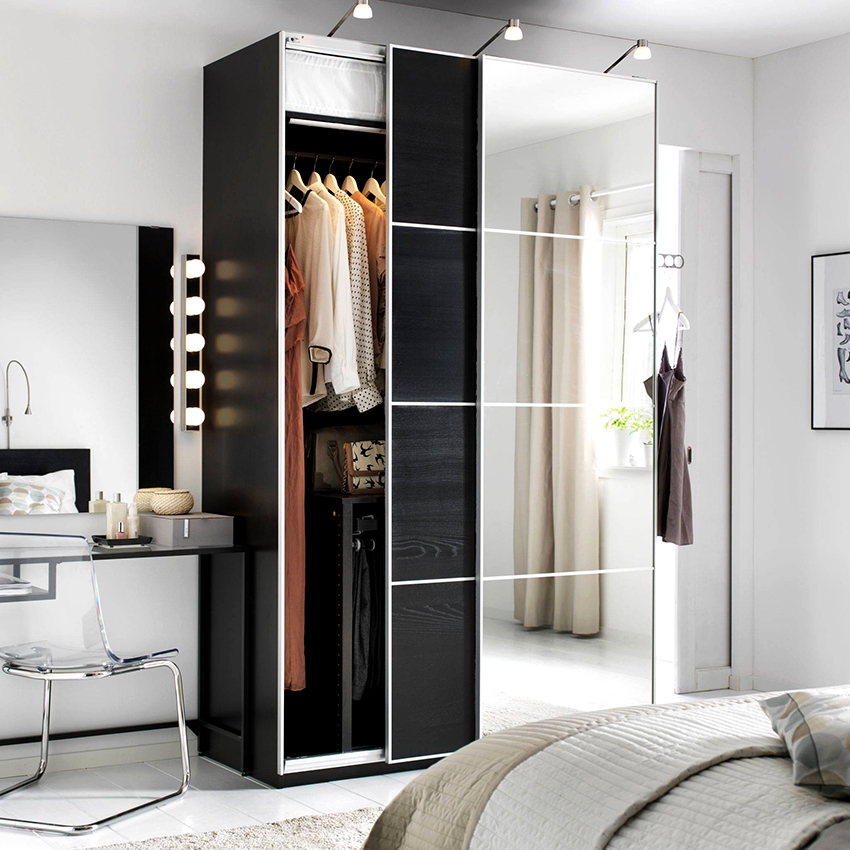 Посредством раздвижных дверок купе экономит место в спальне, в отличие от обычных шкафов с распашными дверями.