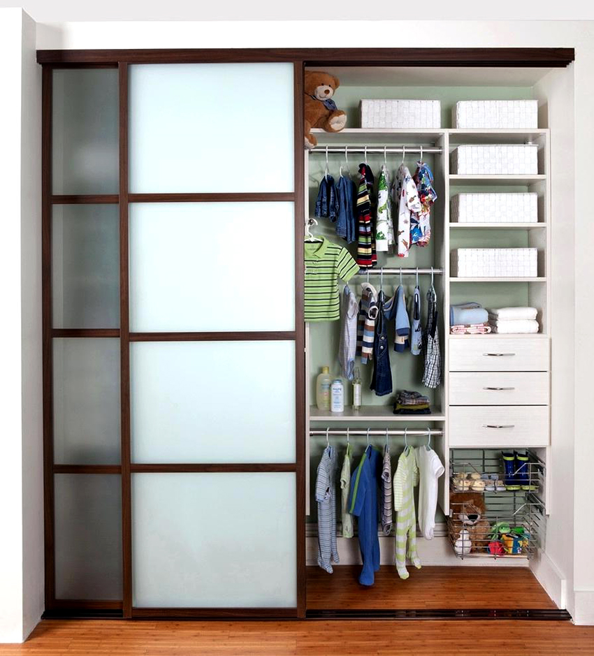 Хранить вещи в детской спальне значит класть одежду и игрушки. Если в квартире нет специального пеленального столика, то в шкафу можно поставить полки для хранения подгузников, нижних рубашек и средств по уходу за ребенком. В зависимости от общей стилистической направленности детской комнаты, двери шкафа могут быть выполнены полностью из зеркального или цветного стекла, или с цветными фотографическими отпечатками персонажей любимых мультфильмов.