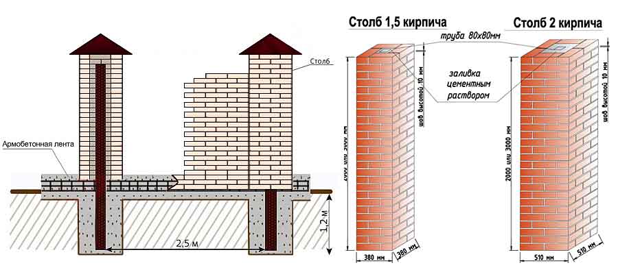 - Высота столбов – планируемая. Она будет приведена к размерам выбранного кирпича и пересчитана в количество рядов с учетом толщины кладочных швов.