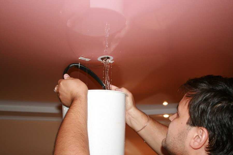 После данных действий следует вызвать мастера из компании по установке натяжных потолков. Если такой возможности нет, то сливать воду придется самостоятельно. Особенно аккуратно нужно избавлять конструкцию от горячей воды.