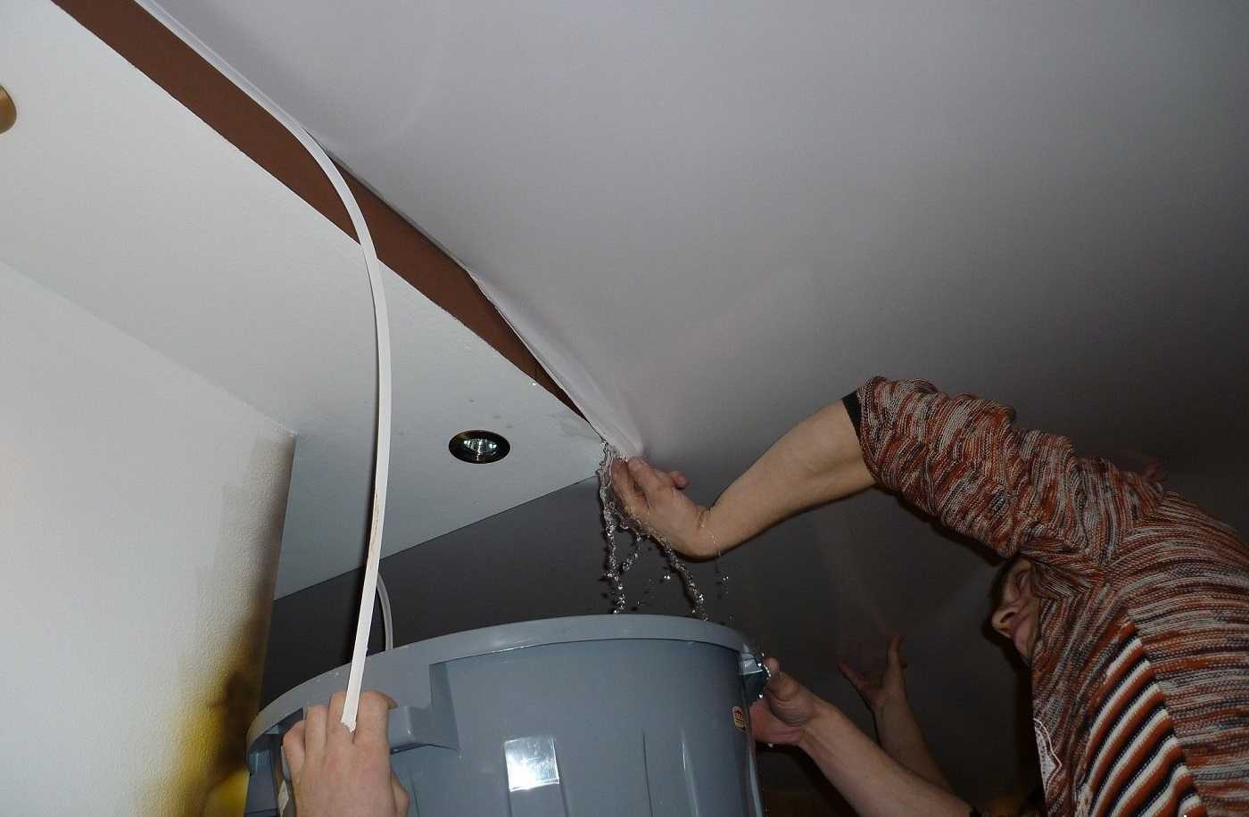 Обнаружив, что в потолке скопилась вода, сразу обесточивают помещение. В противном случае возможно короткое замыкание и поражение электрическим током. Из комнаты выносят бытовую технику и другие предметы, которые могут пострадать. Выясняют причину и устраняют протечку. Если затопили соседи, перекрывают вентили на стояке.