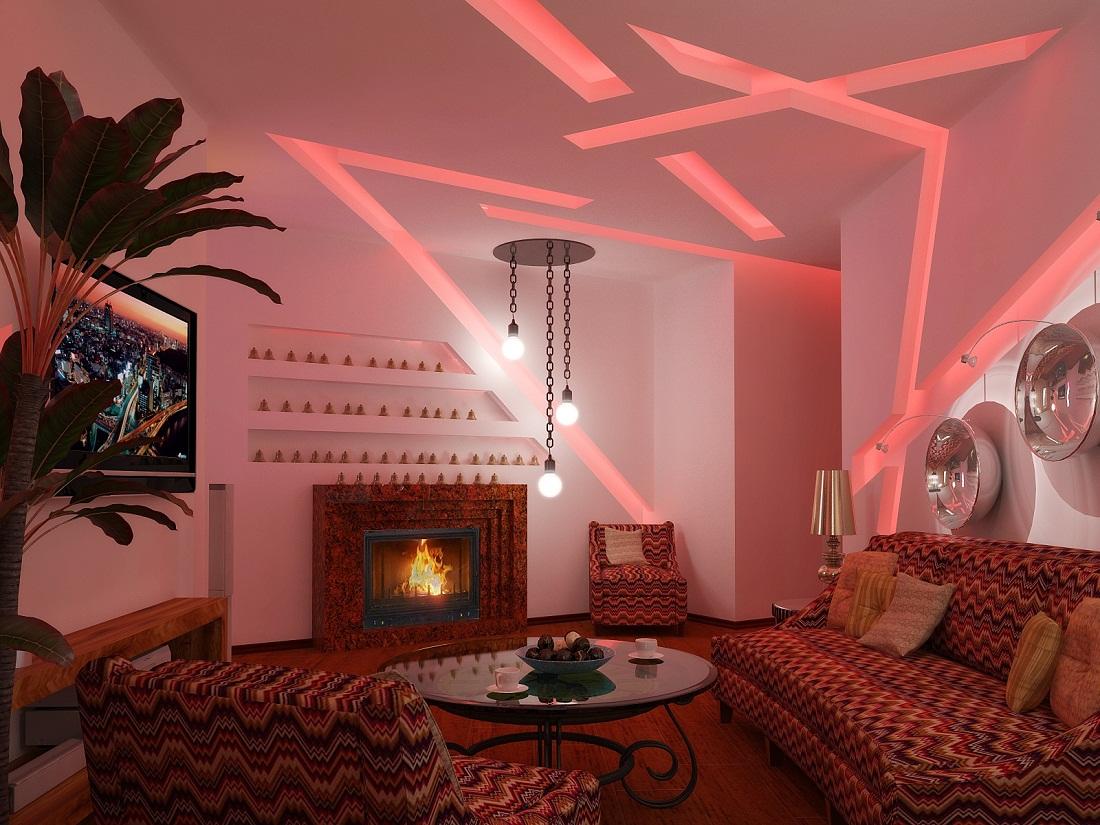 Если стены и потолок окрашены в одинаковый цвет, то разнообразить их можно с помощью нишей из гипсокартона, оснащенных неоновой подсветкой