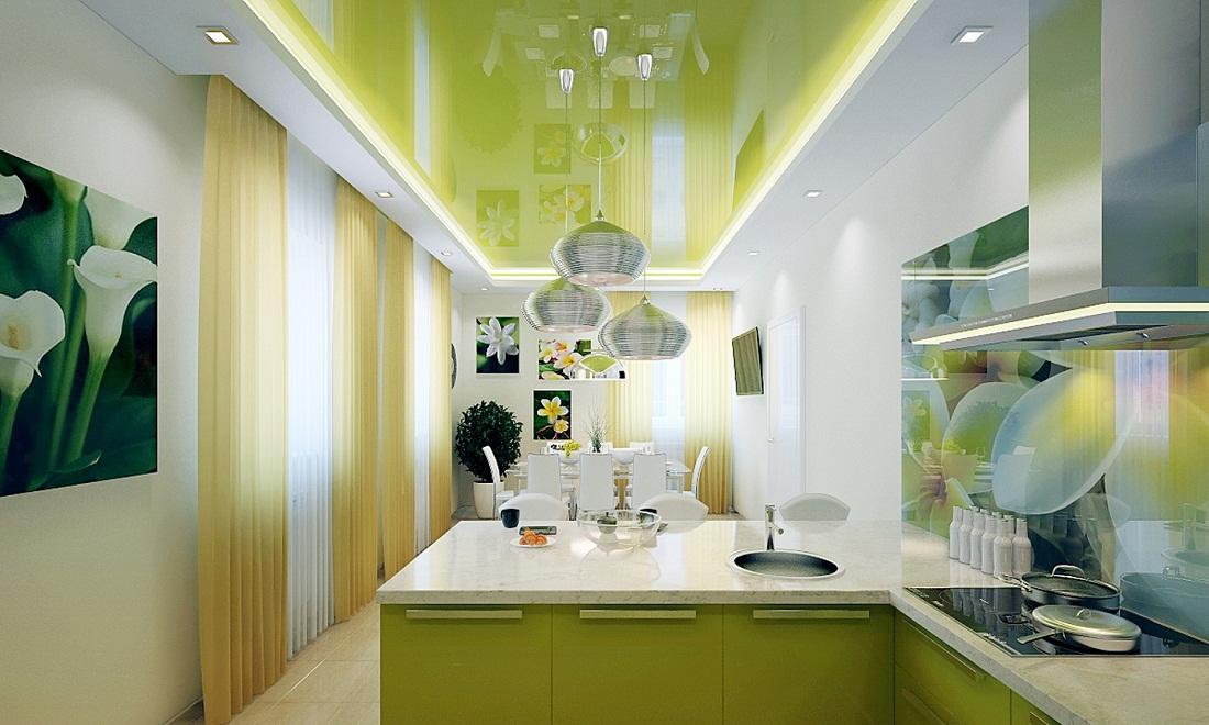 Желтые стены в сочетании с зеленым потолком придадут кухне свежести и оригинальности