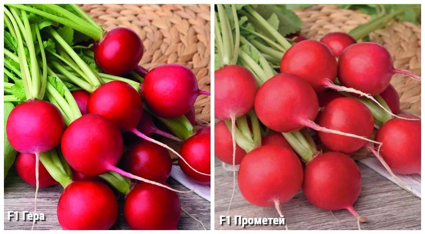 F1 Прометей. Раннеспелый гибрид для открытого и защищенного грунта, подходит для выращивания на подоконнике, балконе и лоджии. В осенне-зимний период необходимо досвечивание. От всходов до сбора корнеплодов 23-27 дней. Растение компактное с короткой темно-зелёной листовой розеткой. Корнеплод округлый, красный с нежной белоснежной мякотью, практически не имеет горечи. Масса 18-22 г. Вкусовые качества отличные. Пригодны не только корнеплоды, но и листья. Употребляется в свежем виде в салатах и окрошке.