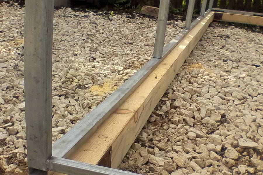 На готовый фундамент уложить венец из брусьев, предварительно обработанных антисептическими средствами. Нижний ряд каркаса закрепить на брусья при помощи «пяток». Если их нет, то приварить их к металлическим элементам каркаса;
