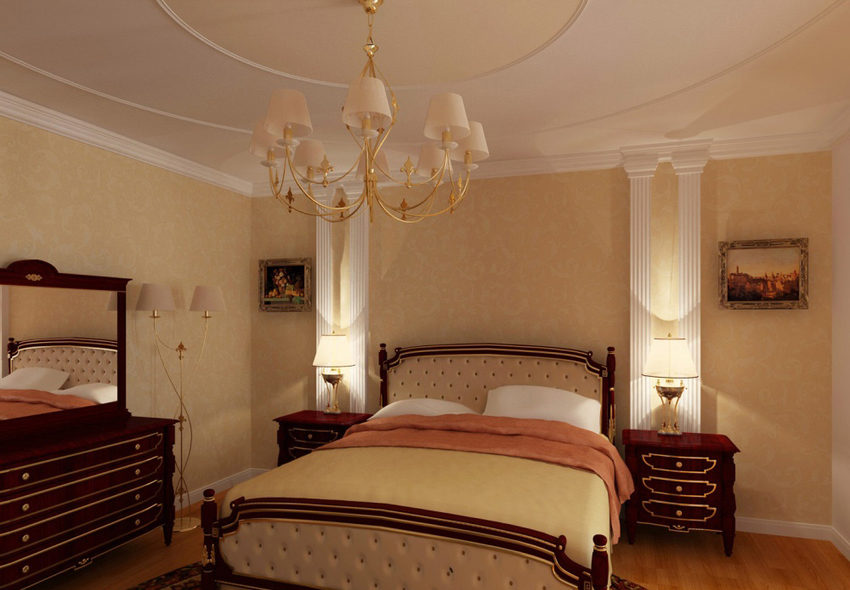 - Классика. В данном случае классика должна ограничиться небольшим количеством украшений: большая люстра, тяжелые шторы в сочетании с легкой тканью и несколько декоративных ваз, подсвечников или статуэток станут отличным решением возникшей проблемы.