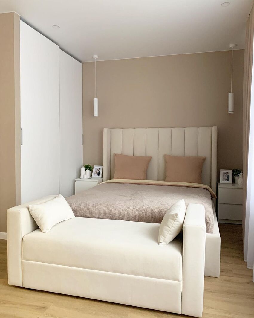 Светлая цветовая палитра — универсальное решение, подходящее спальням любых форм и размеров.