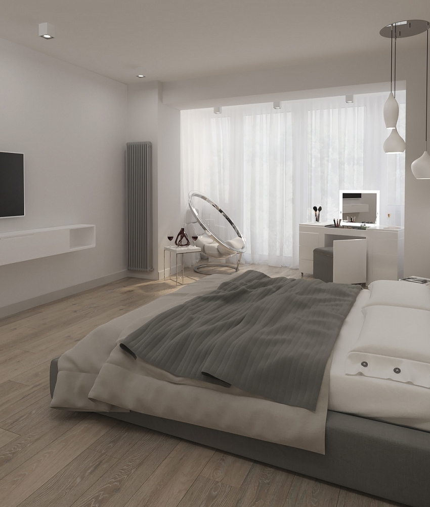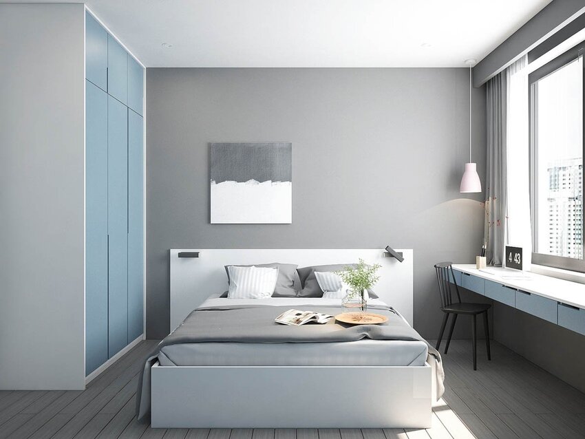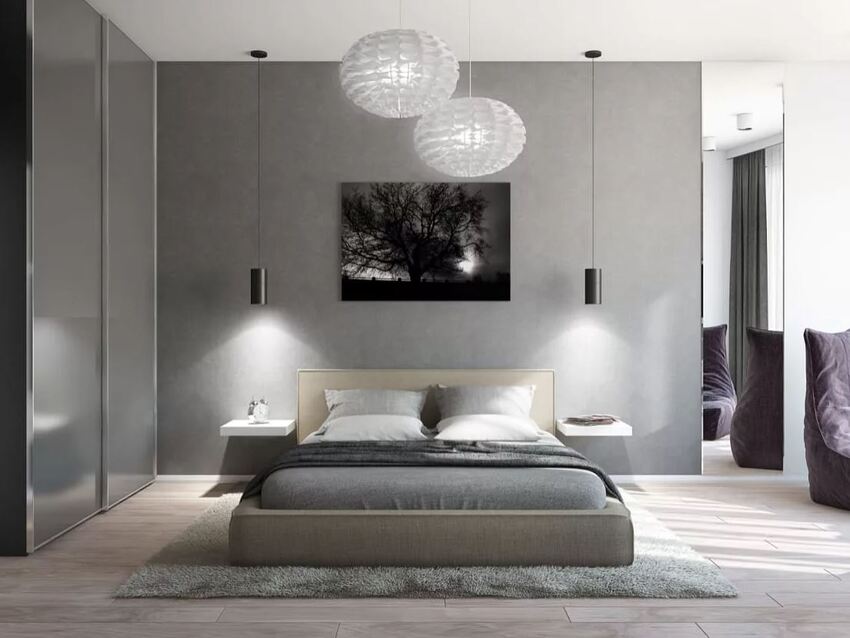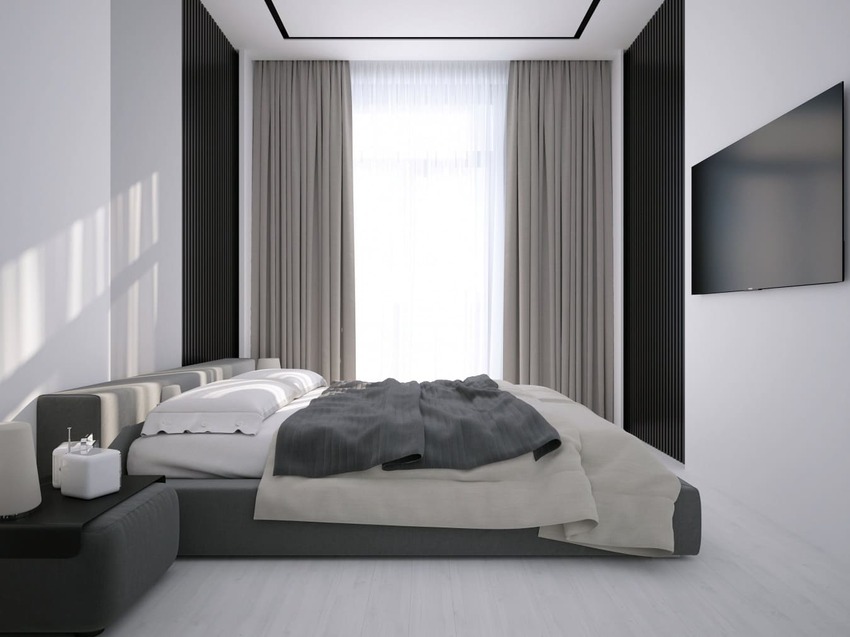 При этом важно разбавлять монохромность и однородность интерьера, чтобы избавиться от эффекта стерильности, делающего спальню неуютной. Для этого используются акцентные цвета, текстиль с рисунками и пр