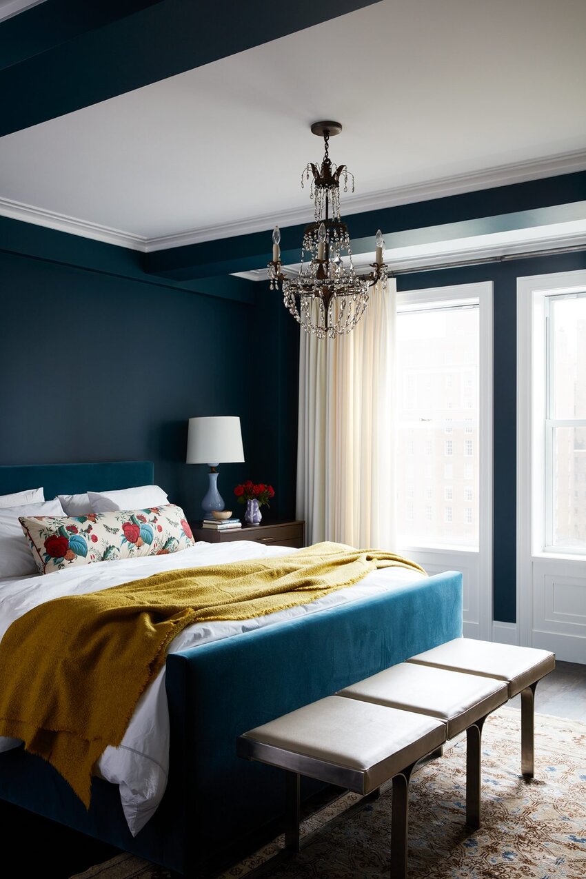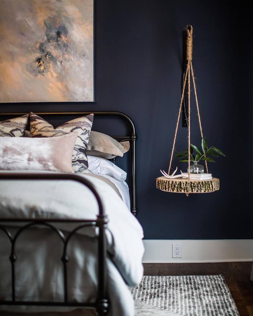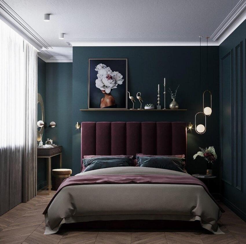 Темное оформление делает спальню уютной и расслабляющей. Такой вариант отделки особенно хорошо подходит для спален, в которых много природного солнечного света.