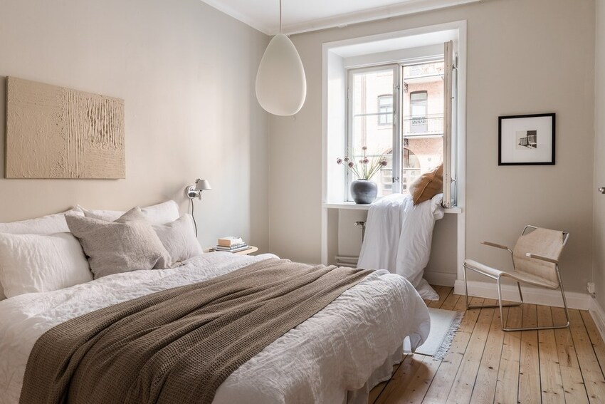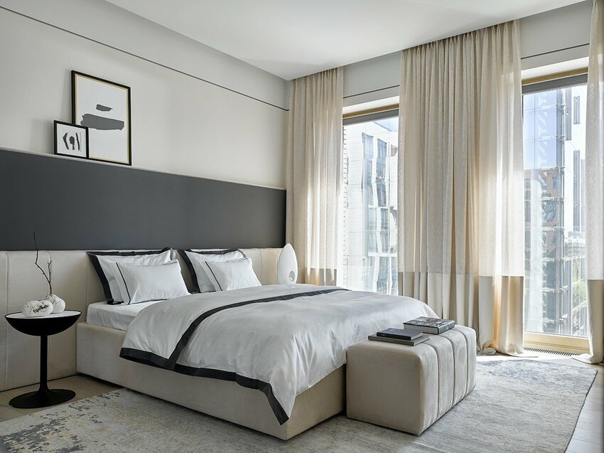 Светлые цвета добавляют в спальню воздух, стирают границы и делают ее более просторной.