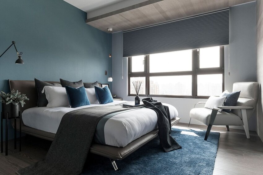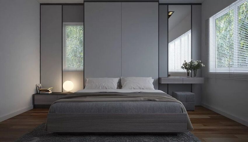 Для спален, окна которых выходят на южную сторону, нужно использовать холодные цвета, например, светло-серый или мятный. Допускается сочетание холодных тонов с теплыми, помогающими сделать спальню более уютной.