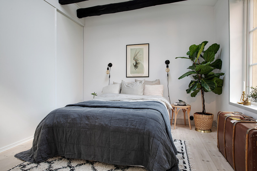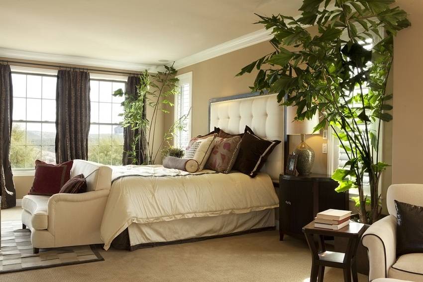 Размеры спальни 14 кв. м позволяют добавить различные украшения вроде живых растений, способных сделать комнату более органичной.