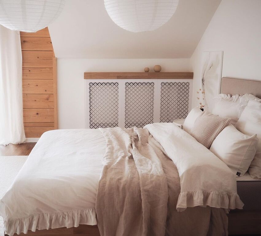 Белые, молочные или бежевые оттенки помогут размыть геометрию комнаты, а серые или ореховые акценты гармонично разбавят однотонный интерьер