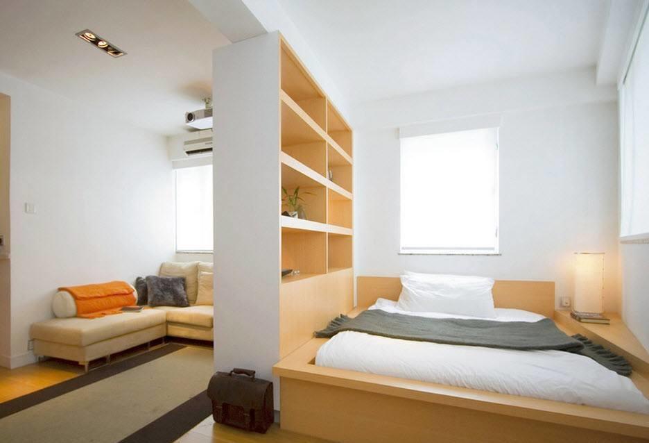 Интимную, то есть спальную зону предпочтительнее оборудовать возле окна. Дело не только в возможности лучше проветрить мини-спальню, но и в уровне психологического комфорта: современному человеку, привыкшему к окнам, бывает неуютно в безоконном помещении. Тем более, если это небольшой «закуток».