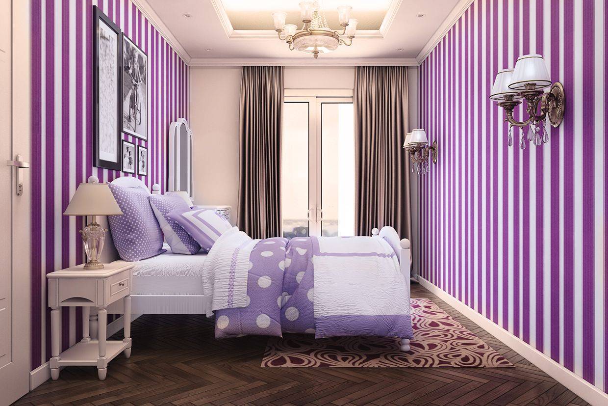 Если спальня маленькая, необходимо купить обои более светлого сиреневого оттенка. В просторной комнате допускается темно-лиловая драпировка стен и даже более яркая.