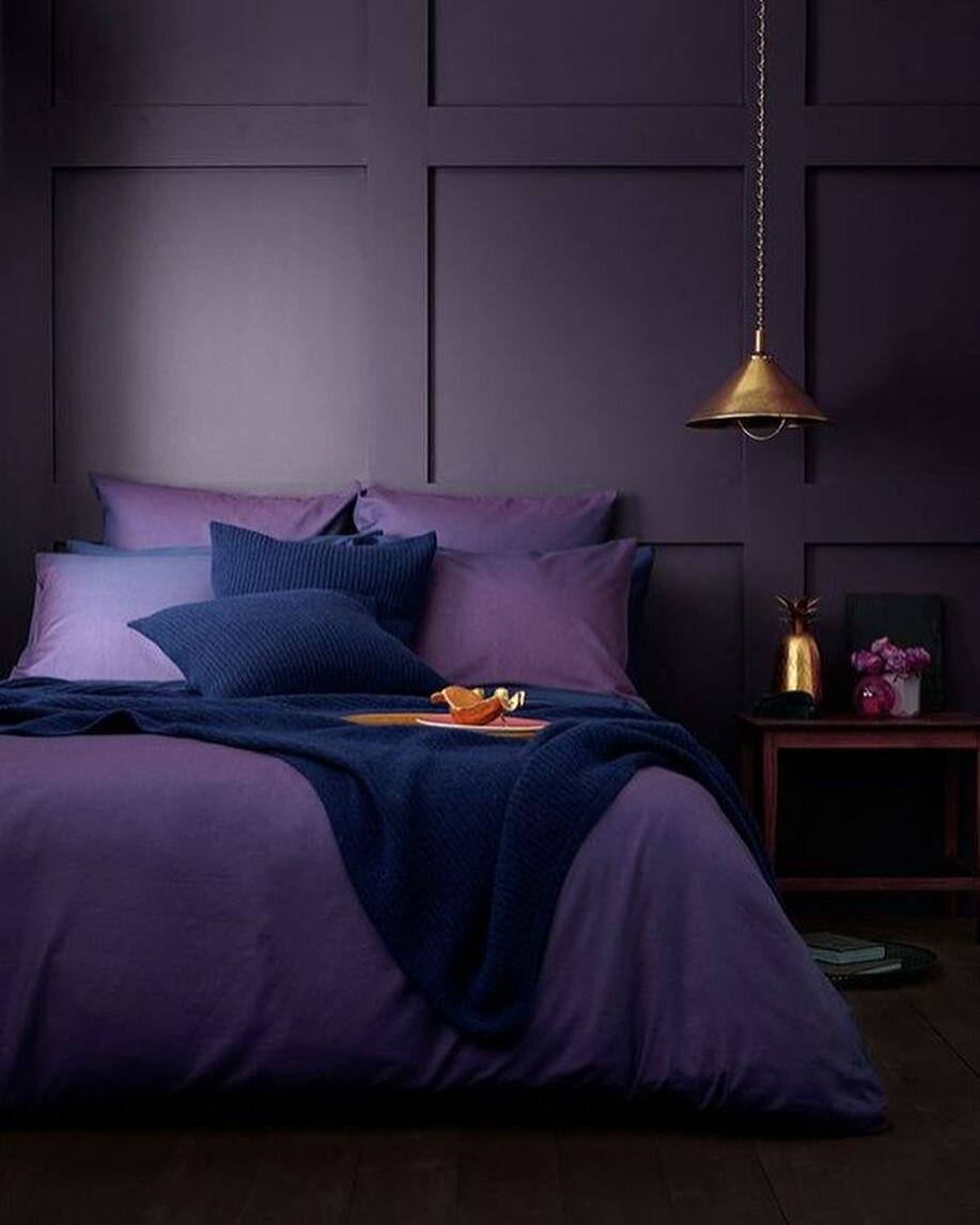 Насыщенные и сочные тона — фиолетовый, ежевичный и лиловый — рекомендуется использовать в небольших количествах. В противном случае спальня будет мрачной с тоскливой и тревожной атмосферой. К тому же, эти цвета будут зрительно уменьшать пространство комнаты.