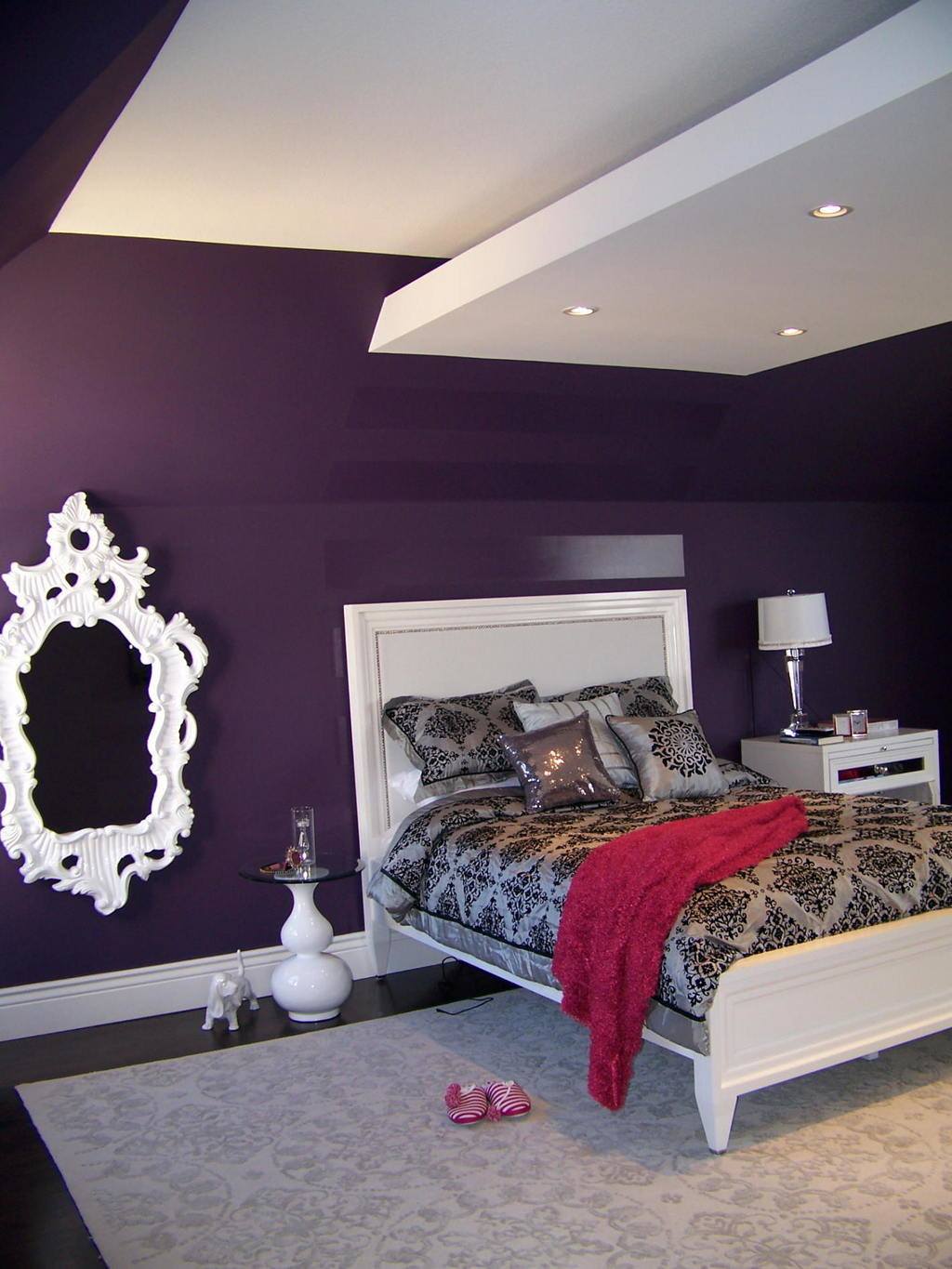 Фиалковые стены отлично сочетаются с темно-коричневым полом. Такая комната представляет интерьер современный, женственный, элегантный. Фиалковая стена – прекрасный фон для пола из темных экзотических пород древесины. Сбалансировать аранжировку поможет немного белого цвета. На фоне фиалковой стены можно красиво представить белую мебель. Фиолетовая спальня с белой мебелью сделает интерьер одновременно модным и уютным.