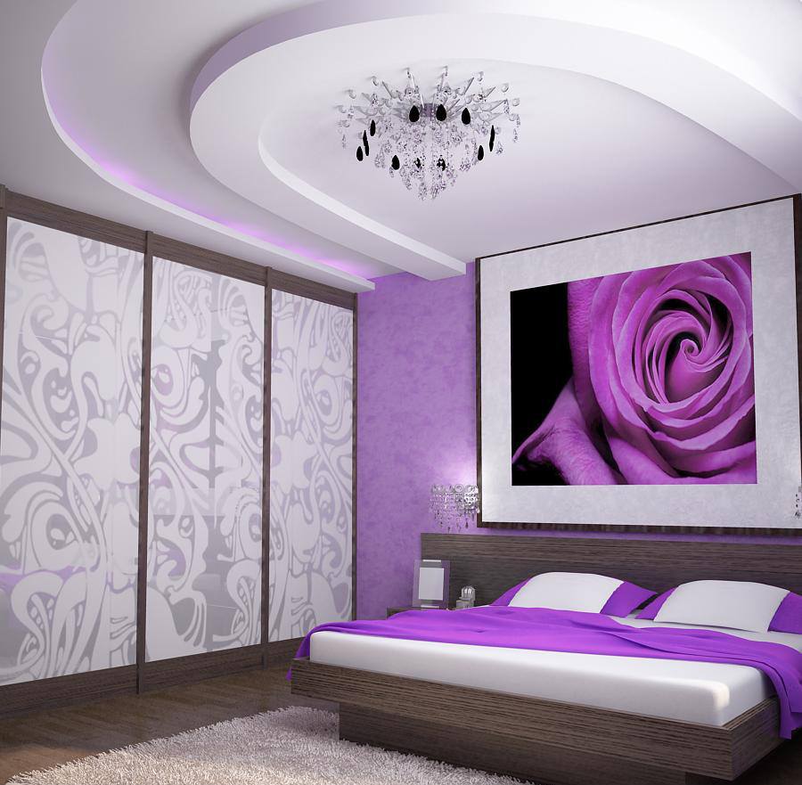 Тут можно выбрать сдержанный белый, молочный или нежно-сиреневый тон. Притом потолок стоит заказать натяжной или оклеить его обоями. Красиво в такой спальне будет смотреться двухъярусный потолок. Внутреннюю часть стоит колорировать светлым оттенком, а короб по бокам оформить в фиолетовом или более ярком лиловом.