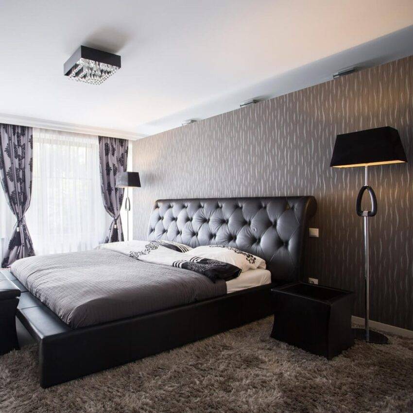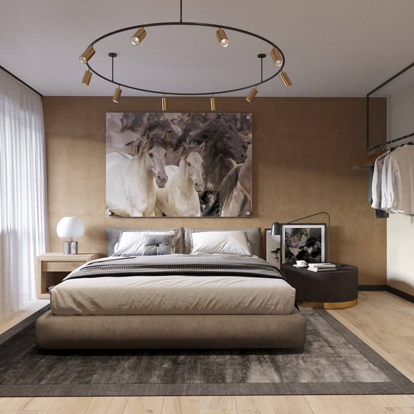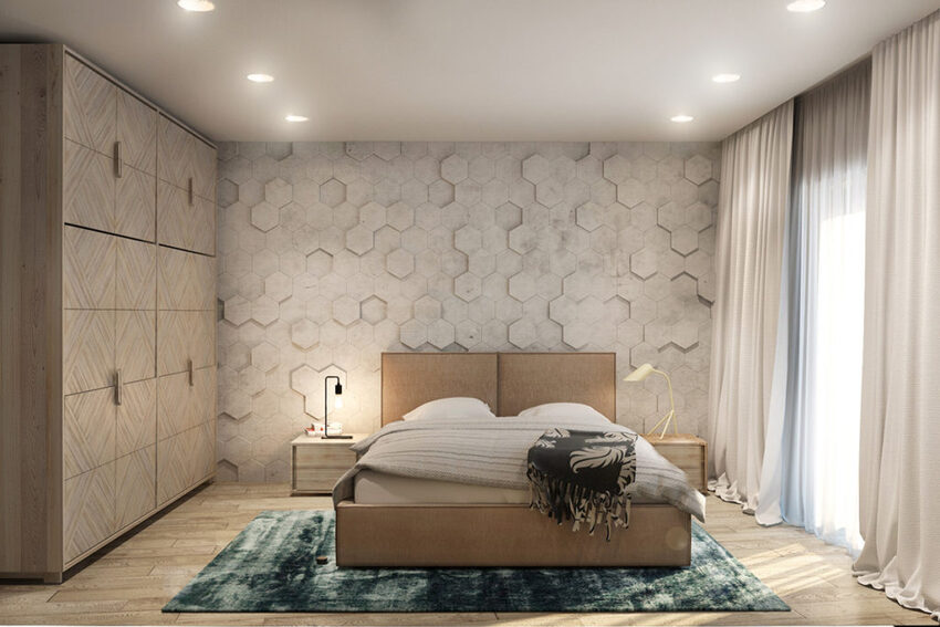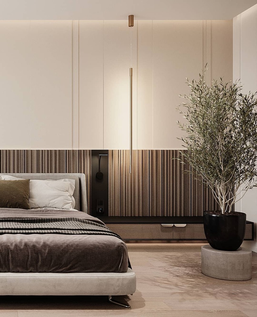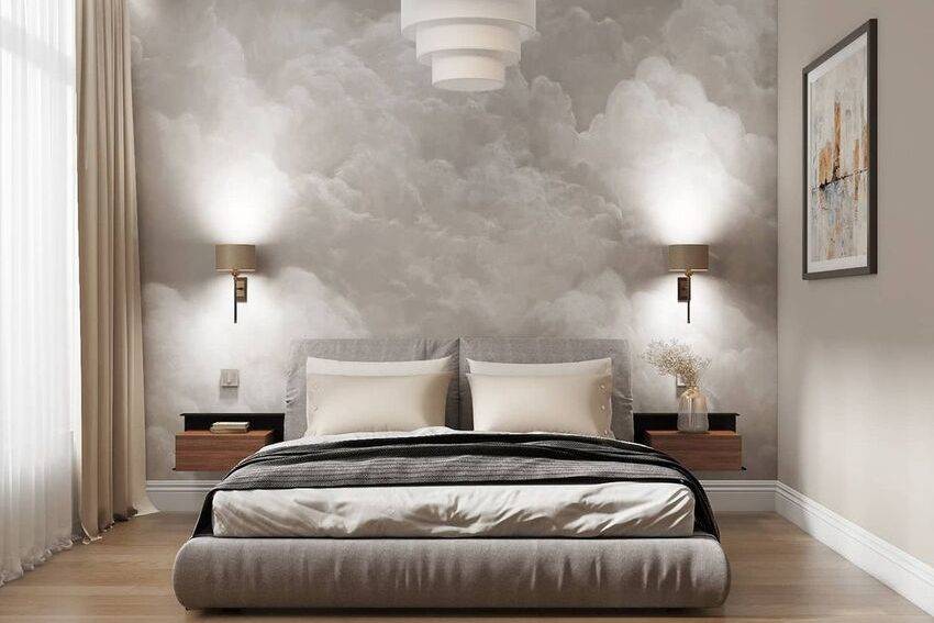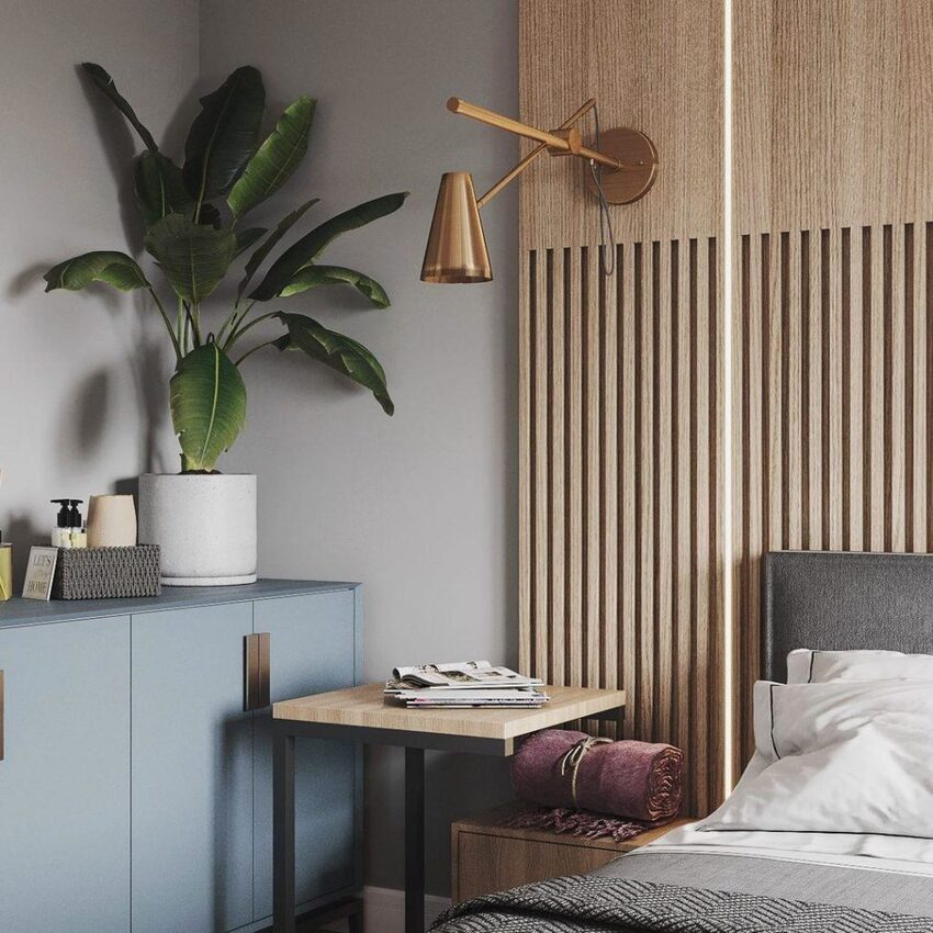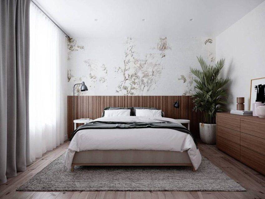 Хороший прием, который актуален для минимализма — создание акцентной стены (обычно над изголовьем кровати, но необязательно). Для её декорирования подбираются обои-компаньоны или цвет краски с более темным оттенком.