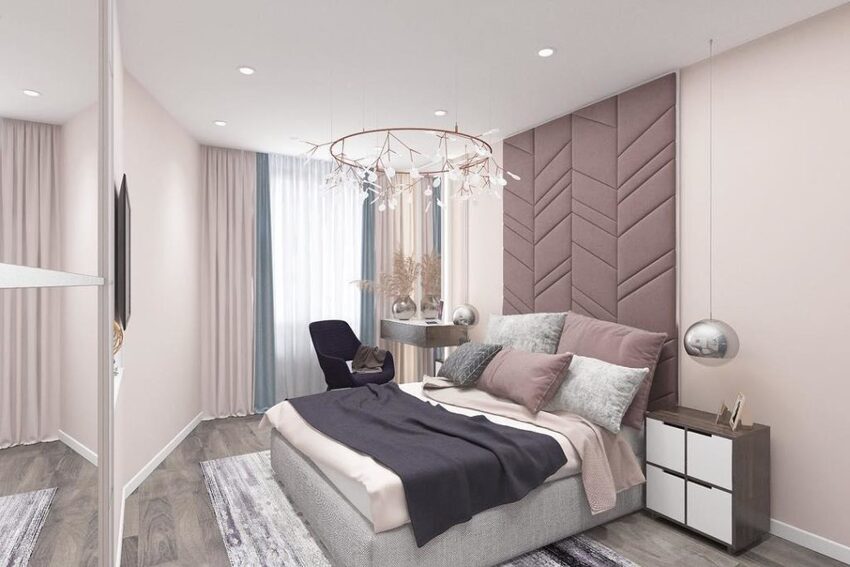 Главный источник освещения в спальне — это потолочная люстра. Для минималистичной спальни все светильники, включая люстры, должны иметь простую форму, лаконичный дизайн, четкую геометрическую форму.