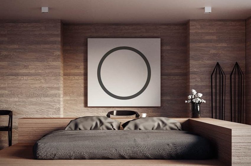 Главным предметом мебели в спальной комнате является кровать. Минимализму идеально подходит кровать-татами, не имеющая изголовья, с ножками – модель очень популярна в Японии. В этом направлении приветствуются конструкции на подиуме. Оптимально, чтобы матрас был меньше по размеру, чем подиум.
