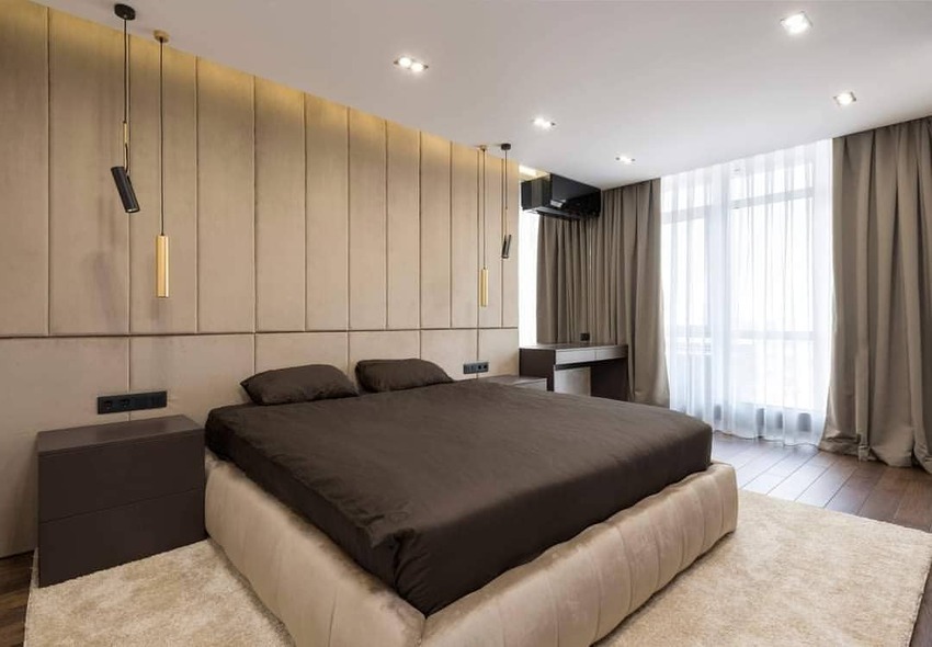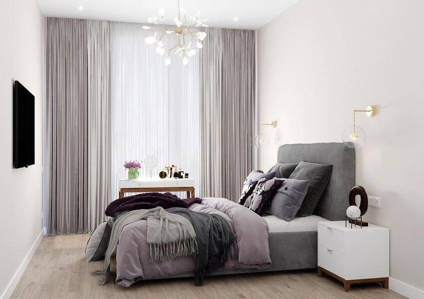Атмосферу простора в спальне придает обильное освещение. Чтобы в комнату попадало как можно больше естественного света, можно установить большие панорамные окна. Их оформляют легкими занавесками или жалюзи.