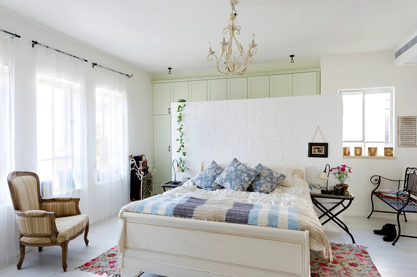 - В спальне особенно элегантно смотрится кованая кровать, окрашенная в белый или светло-бирюзовый цвет с просветами металла. Плюсом такого выбора будет экономия места, каркас выглядит эффектно, при этом он не громоздкий.