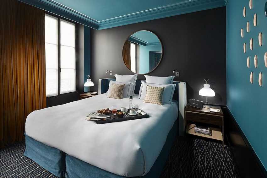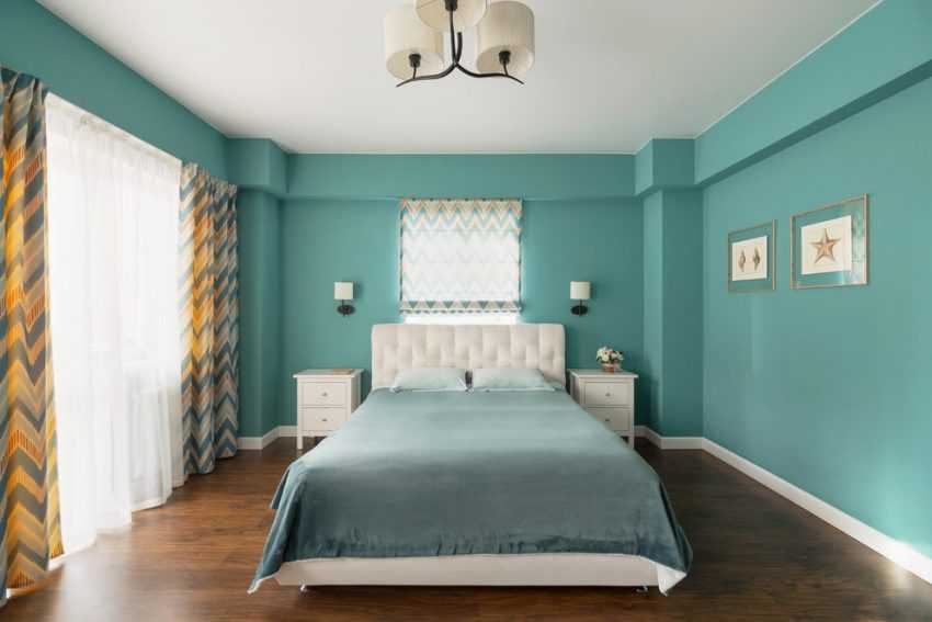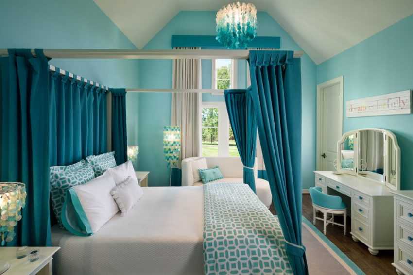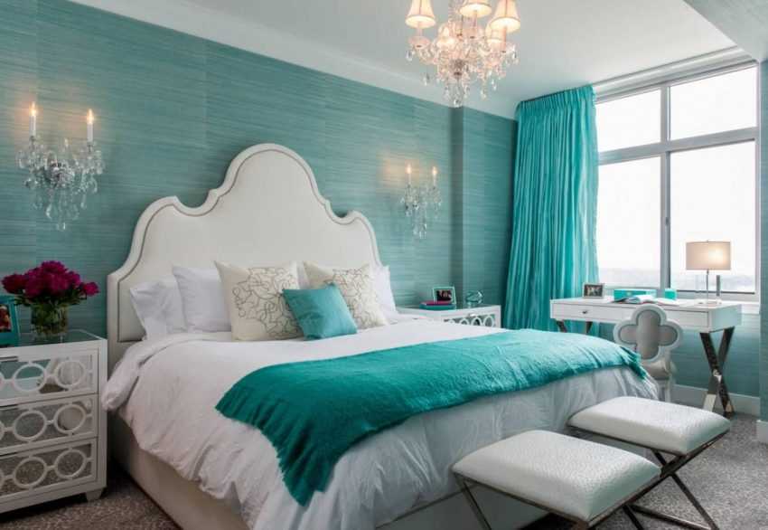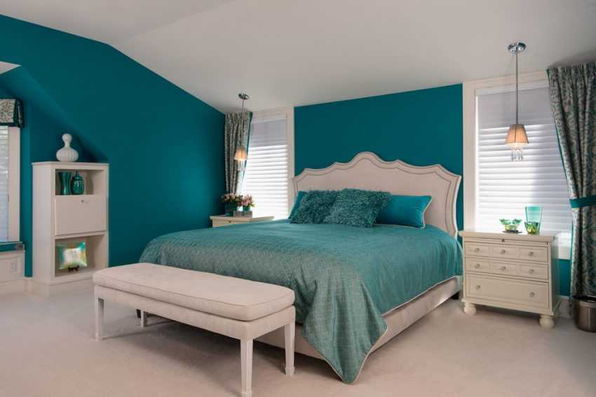 Для спальни в бирюзовых тонах характерны определенные оттенки: