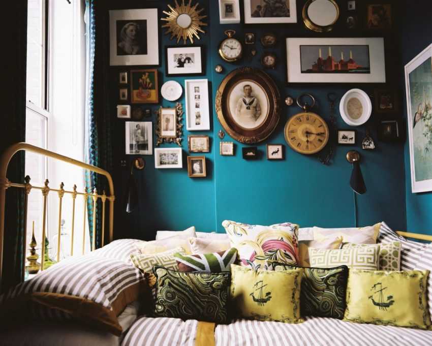 - Золотые рамки на картинах повешенных на бирюзовых стенах смотрятся великолепно и богато.